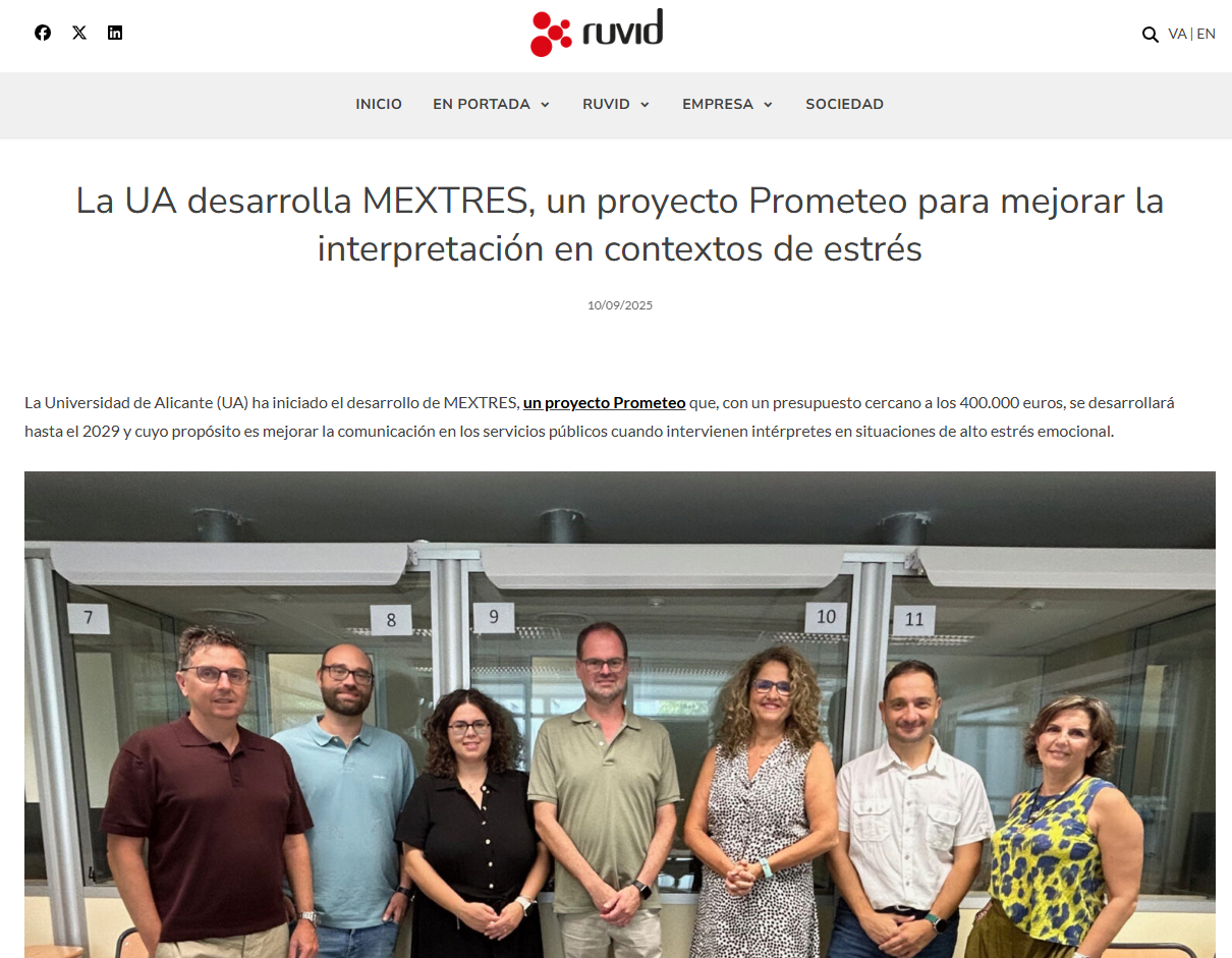 La Universidad de Alicante (UA) ha iniciado el desarrollo de MEXTRES, un proyecto Prometeo que, con un presupuesto cercano a los 400.000 euros, se desarrollará hasta el 2029 y cuyo propósito es mejorar la comunicación en los servicios públicos cuando intervienen intérpretes en situaciones de alto estrés emocional.